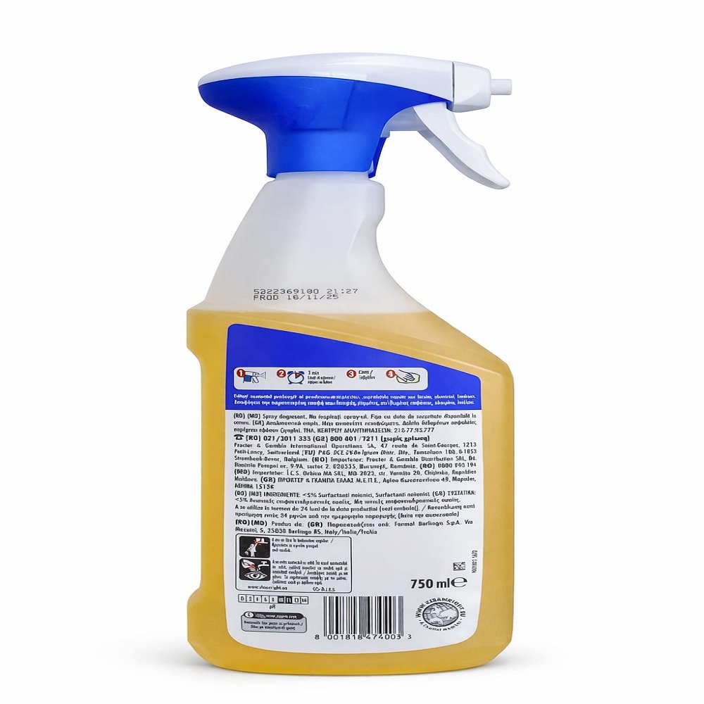 Datorită pulverizatorului practic produsul se aplică ușor și uniform pe suprafețe precum aragaz, hotă, blat sau chiuvetă. Degresantul Fairy este potrivit pentru curățarea diverselor suprafețe expuse la grăsime, contribuind la menținerea curățeniei în gospodărie.