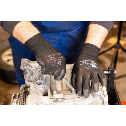 Mănuși de protecție ușoare cu palmă acoperită cu PU, potrivite pentru manipulare materiale, depozit, logistică și lucrări generale unde este necesară aderență bună și flexibilitate.